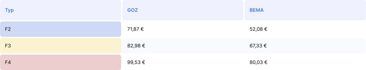 Erklärungsbeispiel Patient 1: Zweiflächige MKV-Füllung (52,08€), plus GOZ-Honorar für die zweiflächige Füllung (71,87€), plus erbrachte BEMA-Leistungen bmf und l1 (27,18€) r, plus GOZ: 2040 und 1020 (14,86€) ergibt zusammen 165,99€